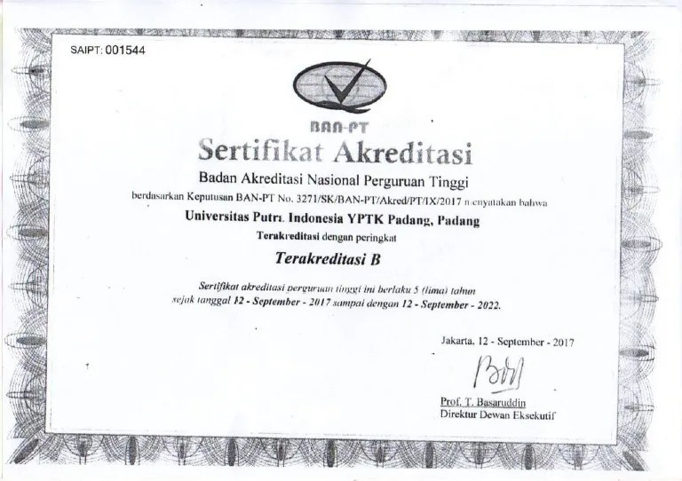 12 september 2017 sampai dengan 12 september 2022. Keputusan badan akreditasi nasional perguruan tin nomor : Lihat sertifikat akreditasi upi yptk tahun 2017 . Sertifikat akreditasi upi 2016 2021. Download sertifikat akreditasi upi yptk tahun 2017.